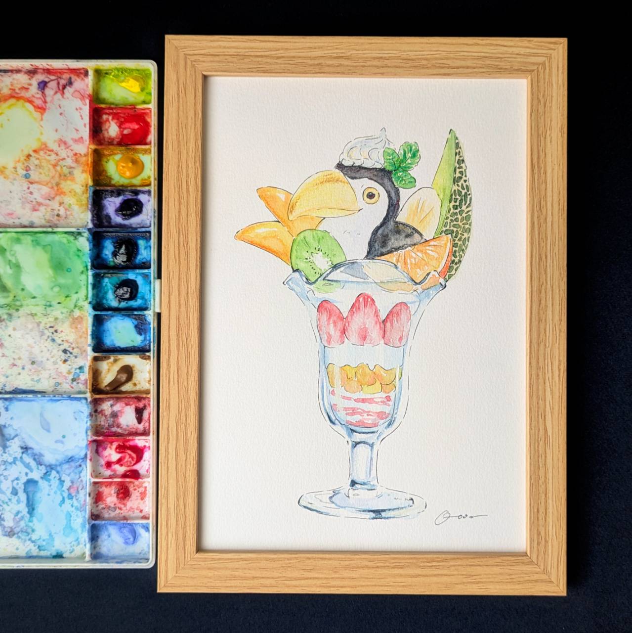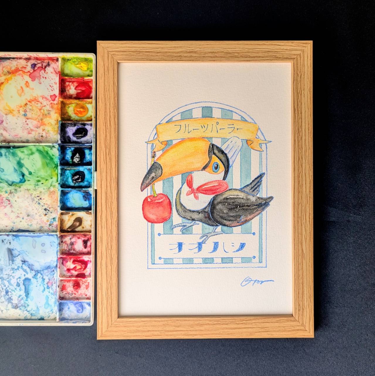 昨年はいつもの出店と同じようにペンギンをメインに、アオアシカツオドリ・ハシビロコウ・オニオオハシなどの鳥作品をお持ちしました。しかし今回は、より小鳥作品に力を入れるため『フルーツパーラーオオハシ』をテーマに、小鳥と果物やカフェのイラストを描き下ろしました。