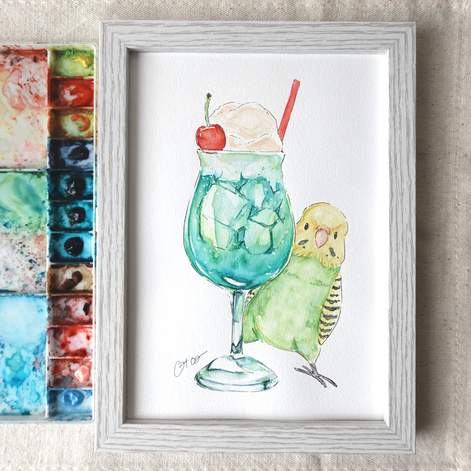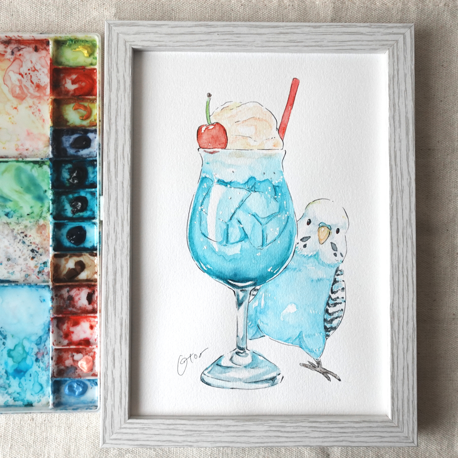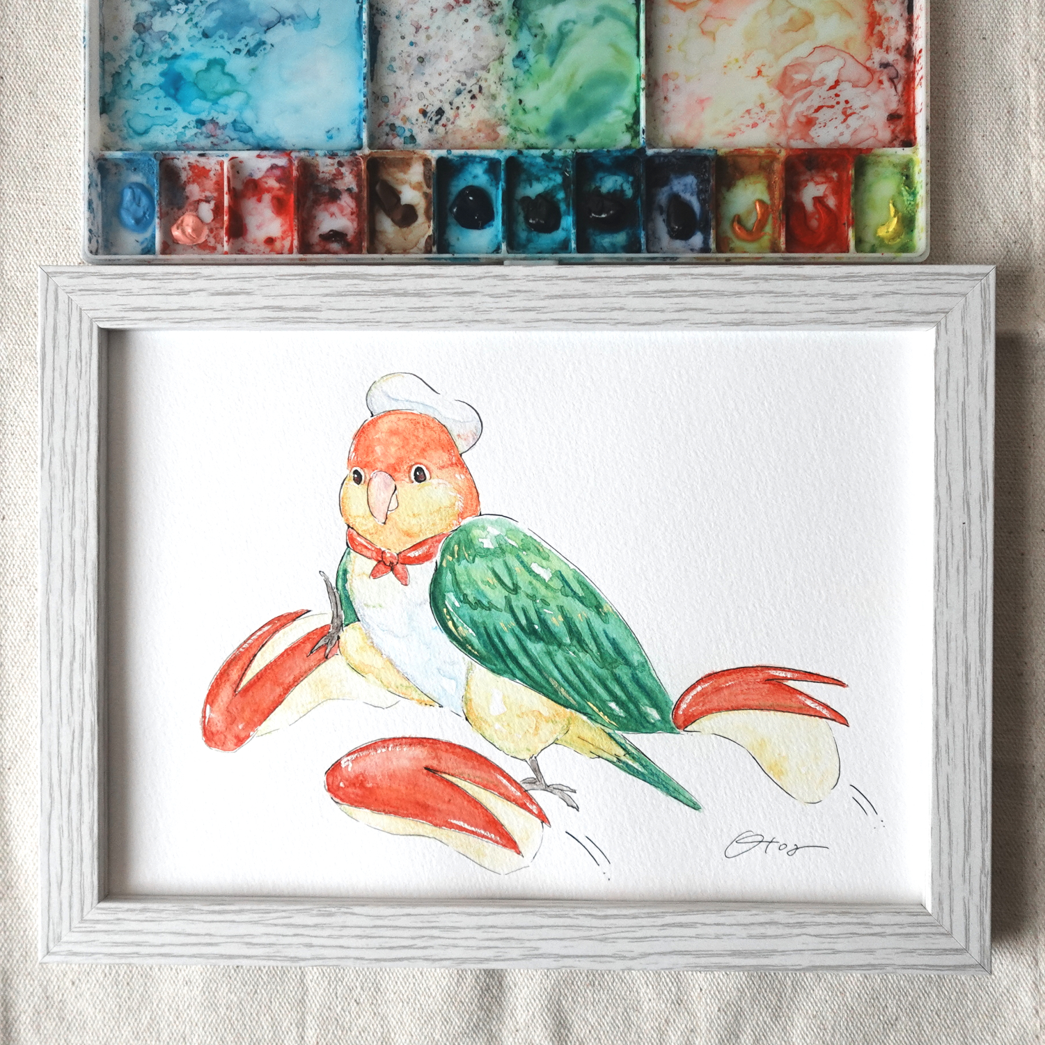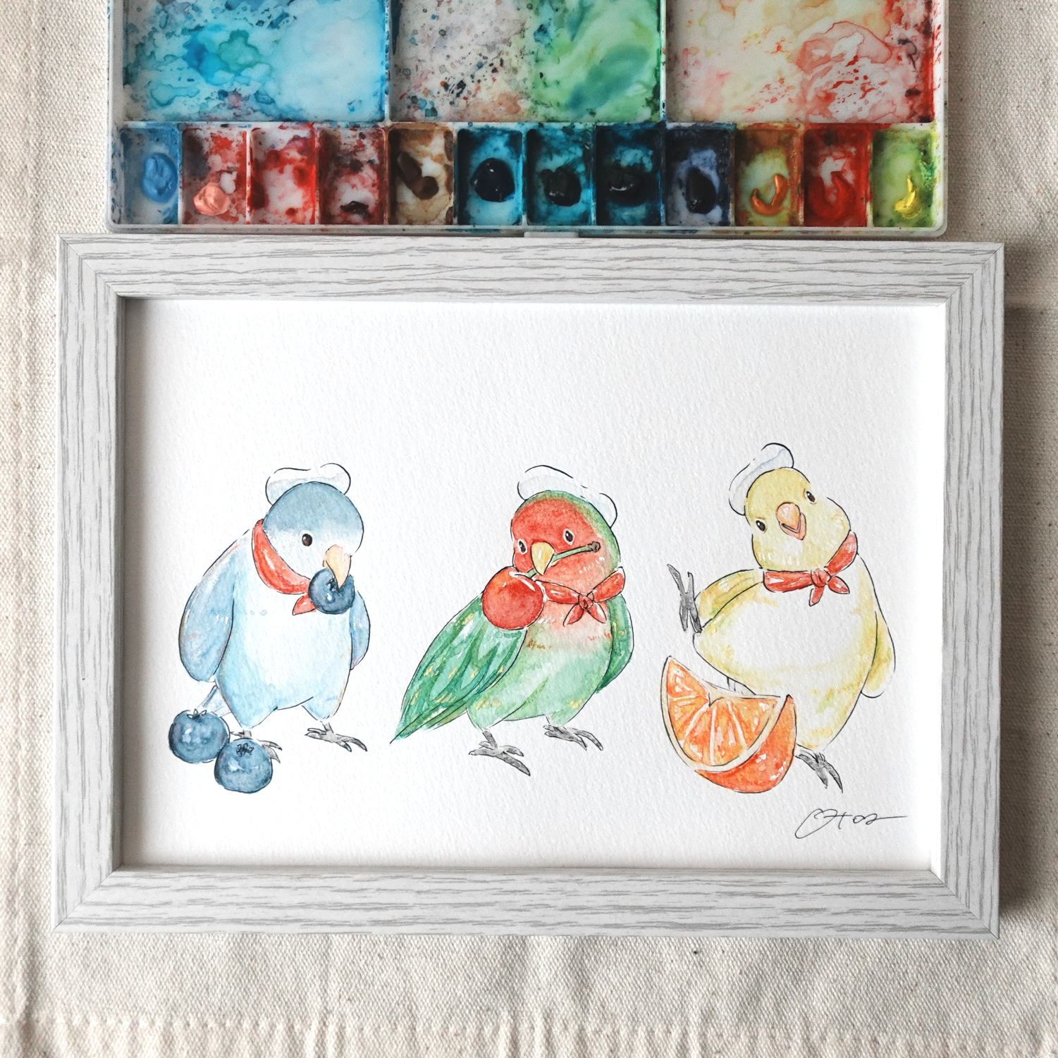 今回の制作にあたり、ペンギンと大きく違ったところは色合いです。基本的にいつも描いているペンギンたちは白と黒がベースなのですが、小鳥たちはどの子もカラフルで、同じセキセイインコや文鳥でも色や模様が違う子もいてとても新鮮でした。