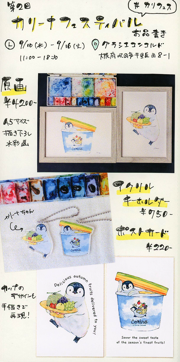 また、ペンギンのキャラクターのカリーナちゃんや果物をモチーフにした雑貨や原画作品の販売や、2階のカフェスペースでは、ペンギン書籍をご覧頂けるペンギン図書館も企画されています。