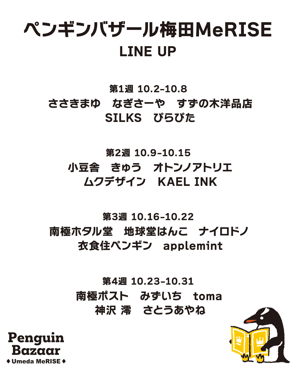 2025/10/2(木)~10/31(金)に TSUTAYA BOOKSTORE 梅田MeRISEさまにて開催の ペンギンバザール梅田MeRISE に委託出展します。
