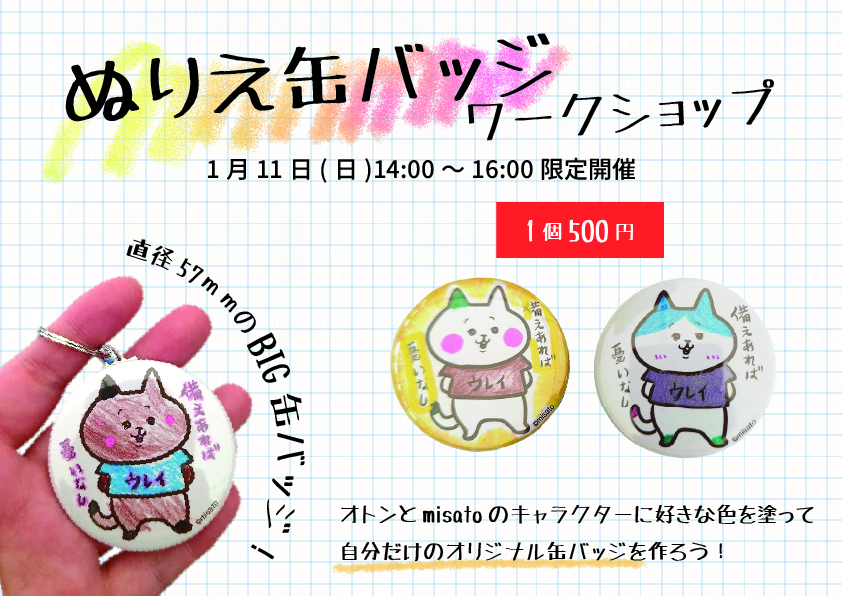 イベント2日目の 1/11(日)14:00~16:00の2時間限定 で、ぬりえ缶バッジのワークショップを行います。